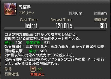 | 付与 | 「鬼宿脚」 威力:200 効果時間:5秒(1秒1ヒット) 再使用時威力:600 最大威力:1600 |