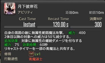 ツクヨミの技です。 非常に強力な技です。 自身の周囲円範囲攻撃で、DoTを付与します。 DoTは、威力75で効果時間60秒です。 DoT合計威力で1500となります。技の威力を足すと1900にもなります。 注意点として、DoTは苦悶の歌と重ね掛けできません。 苦悶の歌より、月下彼岸花のDoTダメージのほうが高いため、誤って上書きしないよう注意しましょう。 リキャスト120秒なので、その間のDoTとして苦悶の歌を使うようにすると良いでしょう。 リキャストタイマーは如意大旋風と共有しています。 月下彼岸花のほうが優秀なので、これ一択でしょう。 ラーニング難易度が非常に難しいですが、覚えているだけで、火力アップします。