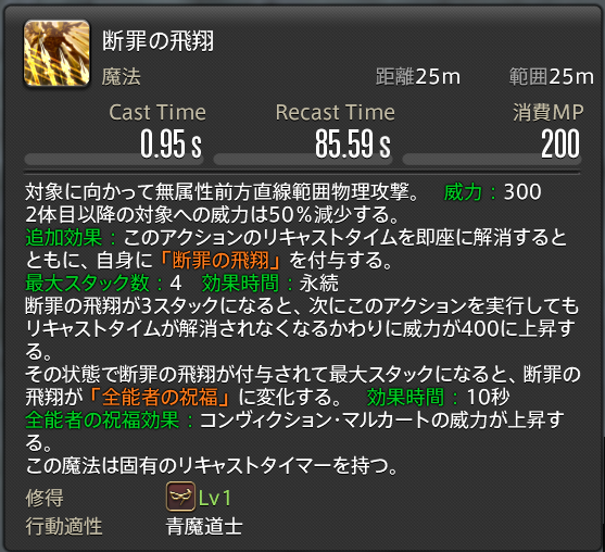 対象に向かって無属性前方直線範囲物理攻撃。 2体目以降の対象への威力は50%減少する。 追加効果:このアクションのリキャストタイムを即座に解消するとともに、自身に「断罪の飛翔」を付与する。 最大スタック数:4 効果時間:永続 断罪の飛翔が3スタックになると、次にこのアクションを実行してもリキャストタイムが解消されなくなる代わりに、威力が400に上昇する。 その状態で断罪の飛翔が付与されて最大スタックになると、断罪の飛翔が「全能者の祝福」に変化する。効果時間10秒 全能者の祝福効果:コンヴィクション・マルカートの威力が上昇する。 この魔法は固有のリキャストタイマーを持つ。