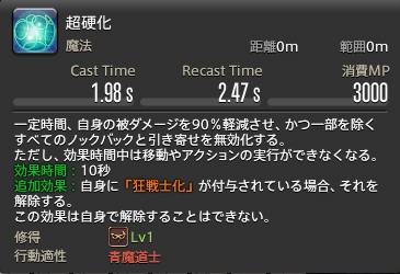 | 付与 | 「超硬化」 効果:被ダメ90%軽減、ノックバック、引き寄せ無効 効果時間:10秒 |