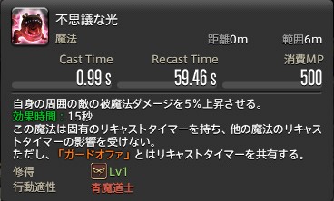 自身の周囲円範囲に、魔法による被ダメ5%アップを付与する技となります。 ガードオファーの範囲版となりますが、こちらは魔法ダメージのみとなりますので、物理攻撃には対象外となります。 リキャストタイマーはガードオファーと共有しており、戦う敵に合わせて、どちらか一方をセットしましょう。