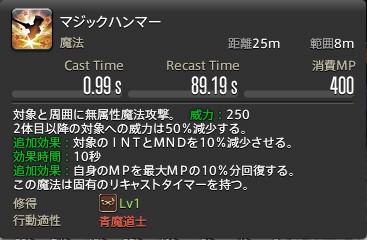 | 付与 | 「INT・MND低下」 効果:対象のINTとMNDを10%減少 効果時間:10秒 自身のMP10%回復 |