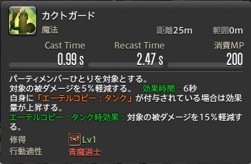 パーティメンバーひとりを対象とする。 対象の被ダメージを5%軽減する。 効果時間:6秒 自身に「エーテルコピー:タンク」が付与されている場合は効果量が上昇する。 エーテルコピー:タンク時効果:対象の被ダメージを15%軽減する。