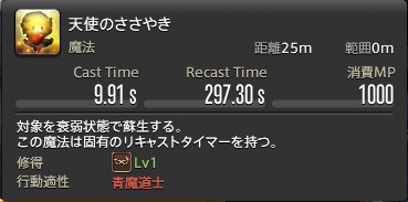 固有のリキャストタイマーを持っており、リキャストが300秒と長いので、パーティメンバーとかぶって無駄うちしないように注意しましょう。