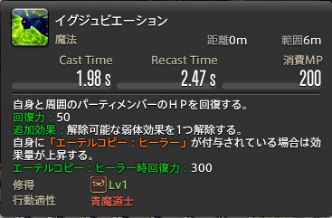 自身及びパーティメンバーを対象とし、自身の周囲円範囲回復で、弱体効果を解除することができる技です。 エーテルコピー:ヒーラーであれば、回復量も増え、範囲回復としても使えます。 弱体効果解除を目的にセットしておくのもよいでしょう。 青魔道士クエストレベル58のお題になります。