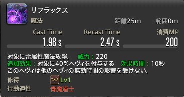 対象に雷属性魔法攻撃。 追加効果:対象に40%ヘヴィを付与する 効果時間:10秒 このヘヴィは他のヘヴィの無効時間の影響を受けない。