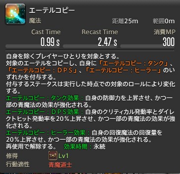 付与以下のいずれか 「エーテルコピー:タンク」 効果:自身の防御力上昇、一部青魔法効果強化 「エーテルコピー:DPS] 効果:自身のクリティカル・ダイレクトヒット発動率20%上昇、一部青魔法効果強化 「エーテルコピー:ヒーラー」 効果:自身の回復魔法の回復量20%上昇、一部青魔法効果強化 効果時間:永続