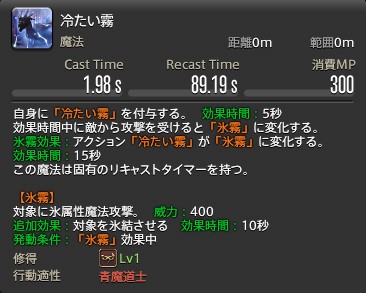 自身に「冷たい霧」を付与する。 効果時間:5秒 効果時間中に敵から攻撃を受けると「氷霧」に変化する。 氷霧効果:アクション「冷たい霧」が「氷霧」に変化する。 効果時間:15秒 この魔法は固有のリキャストタイマーを持つ。 【氷霧】 対象に氷属性魔法攻撃 追加効果:対象を氷結させる 効果時間:10秒 発動条件:「氷霧」効果中