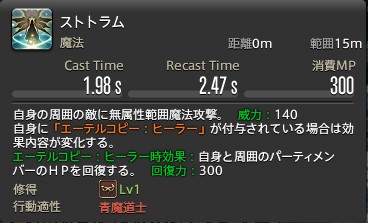 ちなみに、エーテルコピー:ヒーラー以外で使うと、威力が140と低い範囲攻撃となります。なお、青魔法にしては珍しく、2体目以降の対象への威力は50%減少することはありません。なので、敵が多ければ多いほど、他の範囲攻撃より強力になるかと思われます。