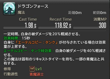 固有のリキャストタイマーを持っており、天使のおやつ、マトラマジックと共有します。エーテルコピー:タンクであれば、ドラゴンフォースをセットしましょう。